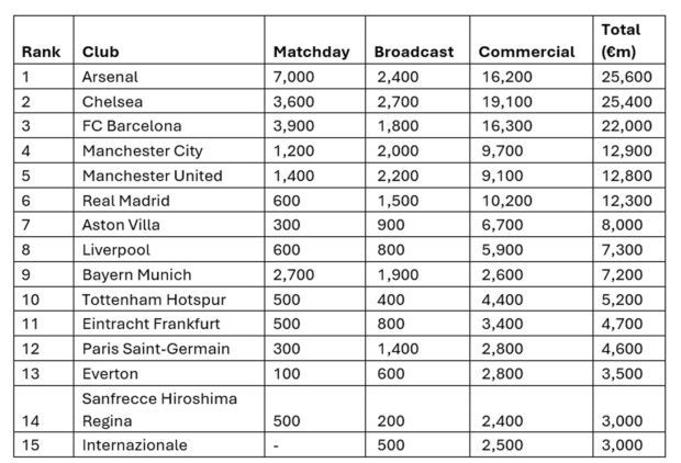 Chelsea se classe deuxième (25,4 millions d’euros) avec les plus hauts revenus commerciaux du top 15 (19,1 millions d’euros). Le FC Barcelone complète le podium avec 22 millions d’euros après une nouvelle saison domestique réussie. Ces trois clubs représentent à eux seuls 46% des revenus totaux du classement et affichent une moyenne de 24,3 millions d’euros, plus du triple de celle des douze autres équipes (7 millions d’euros). Tous trois ont remporté des trophées majeurs durant la saison 2024-25.