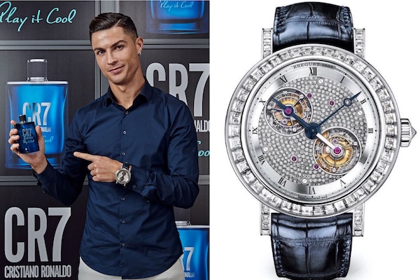 L’attaquant de la Juventus Turin s’est présenté à la presse, avec à son poignet un modèle Breguet à double tourbillon. Cette montre incorpore plus d’une centaine de diamants en baguettes, sur le cadran et le bracelet. Elle est donnée proche du million d’euros, mais c’est d’abord une pièce unique à la valeur difficilement estimable.