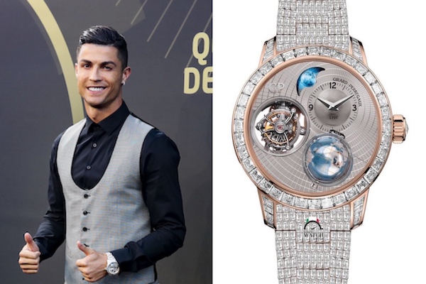 L’attaquant de la Juventus Turin s’est présenté à la presse, avec à son poignet un modèle Breguet à double tourbillon. Cette montre incorpore plus d’une centaine de diamants en baguettes, sur le cadran et le bracelet. Elle est donnée proche du million d’euros, mais c’est d’abord une pièce unique à la valeur difficilement estimable.