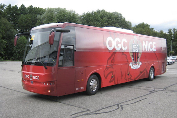 Les joueurs de l’OGC Nice voyagent tout confort dans un bus intégralement habillé aux couleurs du club