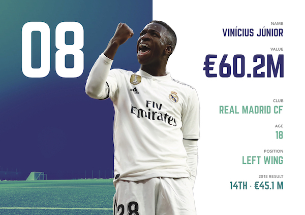 D’après une étude de Soccerex, réalisée avec Prime Time Sports, Kylian Mbappé est le joueur U21 le plus cher au monde, pour la deuxième année consécutive. L’attaquant du PSG est estimé à environ 261 M€. C’est la première fois qu’un joueur de cette catégorie d’âge dépasse les 200 M€. Ses performances continuent de surprendre (33 buts en Ligue 1 sur la saison 2018-19), et sa valeur estimée a augmenté de près de 70 M€, par rapport à l’année dernière.