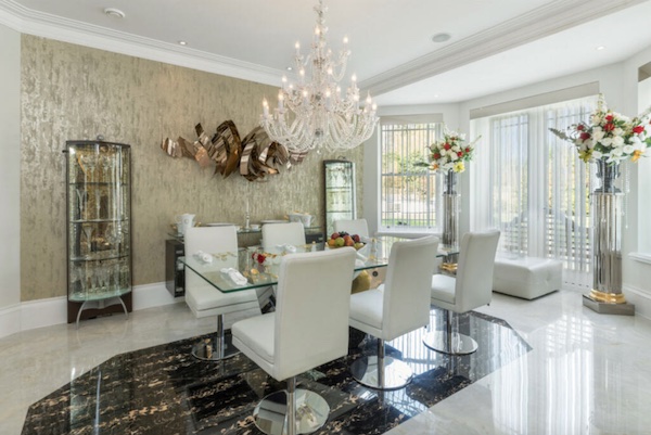 Dès le franchissement des portes électriques, le ton est donné. Une allée pavée, enjambant un ruisseau, mène à un garage double dont les dimensions pourraient accueillir une Rolls Royce Droptail. Le vestibule d’entrée en double hauteur, agrémenté d’un piano à queue automatisé, annonce le niveau de raffinement de la demeure.