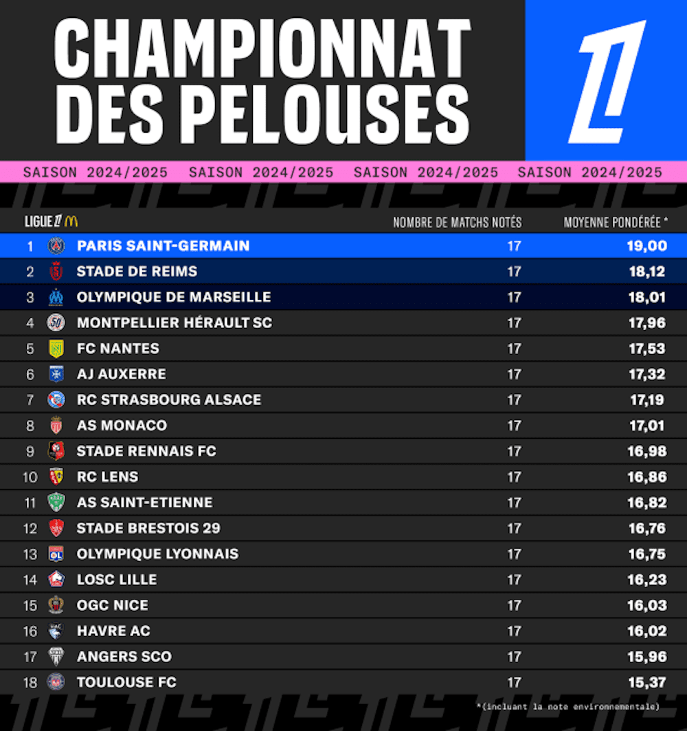 Pour la deuxième année consécutive, le club de la capitale domine donc ce classement alternatif qui récompense la qualité des terrains de jeu, confirmant l’excellence de ses infrastructures et de son entretien. Avec une moyenne quasi parfaite de 19 sur 20, le Paris SG maintient son statut de référence en matière de qualité de pelouse.