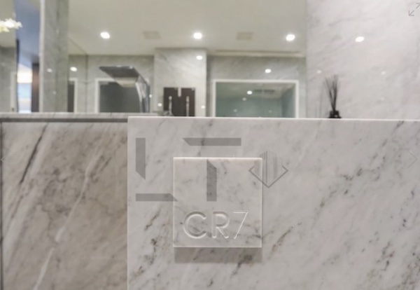 Les initiales CR7 gravées dans le marbre d’une salle de bain