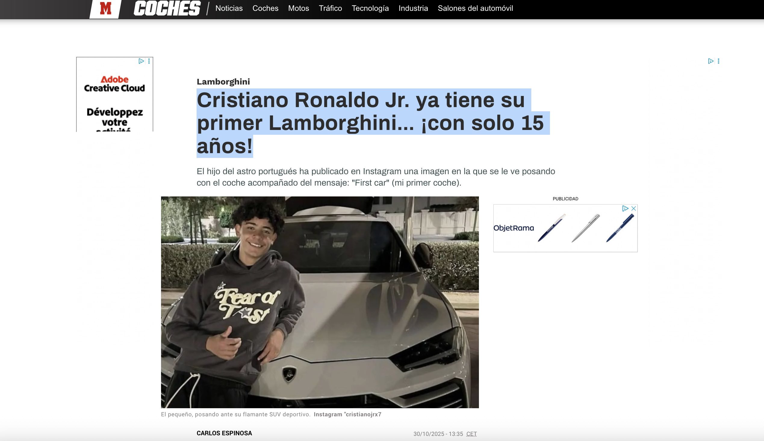 A 15 ans, Cristiano Jr, fils de l’illustre Cristiano Ronaldo est loin de l’âge de ses premières automobiles. Qui plus est d’être en capacité de conduire une Lamborghini. C’est pourtant ce qu’il se dit à son sujet, marquant titrant ce jeudi : « Cristiano Ronaldo Jr. possède déjà sa première Lamborghini… à seulement 15 ans ! » Le journal sportif espagnol en prend pour preuve la photo d’un jeune homme qui ressemble il est vrai beaucoup à CR7 Jr, et appuie son propos sur un partage du jeune homme sur ses réseaux sociaux.