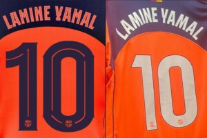 Le rendu n'est pas le même entre le modèle original du maillot third du Barça, à gauche, et celui qu'impose…
