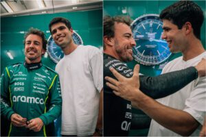 A gauche, Carlos Alcaraz porte une montre, à droite, elle a été supprimé par la communication d'Aston Martin. En visite…