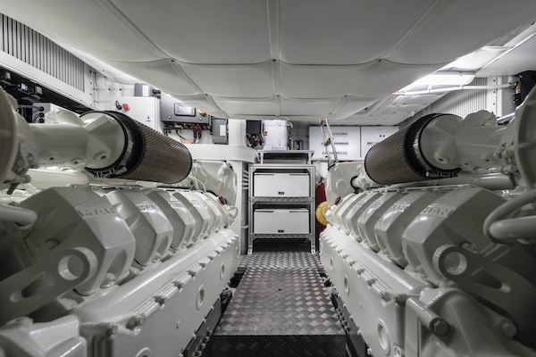 Le yacht est équipé de deux moteurs MAN V12 de 1550 chevaux, lui permettant d’atteindre une vitesse maximale de 48 nœuds. Le pont supérieur dispose d’un vaste espace de relaxation avec un grand salon et une terrasse spacieuse. L’aménagement intérieur comprend une suite parentale avec salle de bains privative, une chambre d’invités équipée d’un lit double et d’un grand miroir, ainsi qu’une troisième chambre avec deux lits simples.