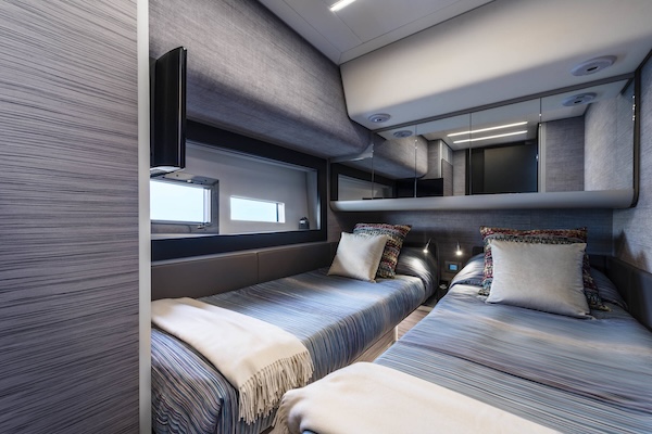 Le yacht est équipé de deux moteurs MAN V12 de 1550 chevaux, lui permettant d’atteindre une vitesse maximale de 48 nœuds. Le pont supérieur dispose d’un vaste espace de relaxation avec un grand salon et une terrasse spacieuse. L’aménagement intérieur comprend une suite parentale avec salle de bains privative, une chambre d’invités équipée d’un lit double et d’un grand miroir, ainsi qu’une troisième chambre avec deux lits simples.