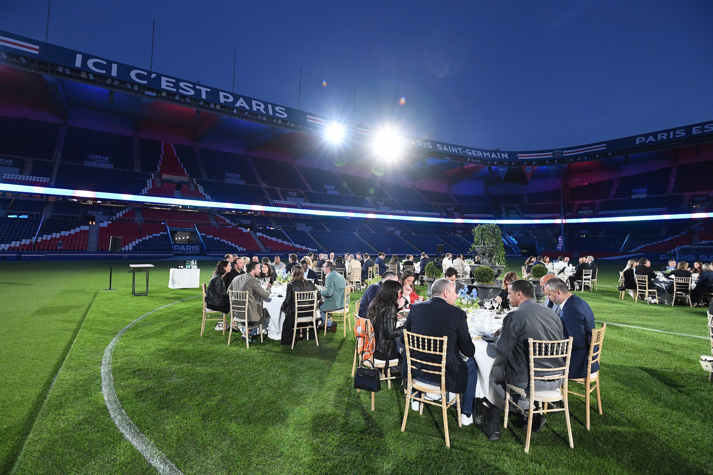 C’est un rectangle vert qui n’est jamais accessible au public. Le Paris Saint-Germain et ses équipes en charge des espaces verts y veillent comme à la prunelle de leurs yeux. Mais la saison est terminée pour les rencontres à domicile, et pour le club de la capitale, elle fut exceptionnelle. Alors a-t-il souhaité la célébrer en grande pompe en invitant ce lundi soir, une centaine de ses partenaires commerciaux et VIP, à un dîner de prestige en plein centre de la pelouse du Parc des Princes.