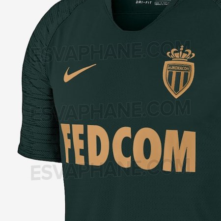 A l’extérieur, le template graphique sera normalement le même, mais d’une seule couler de fond en apparence du vert foncé ou vert bouteille. Plus du doré, pour le club princier, dans un style de couleur qui rappelle un peu tel qu’on le voit, le modèle de la saison 2015-2016 des Monégasques.