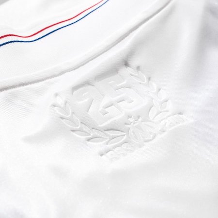 Au dos est imprimé ton sur ton, le 25 anniversaire entouré de lauriers. Ce maillot, disponible en pré-commande chez certains détaillants et déjà en rupture de stocks, seraplus largement proposé à la vente, à l’approche du 26 mai. Normalement au prix de 90 euros. L’équipementier allemand est branché rétro, en ce début d’année 2018, avec notamment des versions spéciales pour plusieurs grands clubs, dont un récemment dévoilé, par Karim Benzema à l’image.