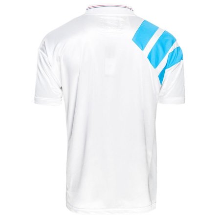 Ce 26 mai 2018, cela fera en effet 25 ans pile, que l’Olympique de Marseille a gagné la première et à ce jour encore unique coupe aux Grandes oreilles, du football français. A l’époque, les Phocéens jouaient déjà dans un ensemble à couleur blanche en dominante, teintée de bleu ciel. Les bandes iconiques de la marque étaient plus marquées, en diagonale sur l’épaule droite. Sur cette réédition, n’est pas présent le sponsor de l’époque, Eurest. Ni l’étoile dorée au-dessus du logo de l’OM : normal, elle ne doit sa présence qu’à la victoire en C1, elle n’est donc apparue qu’après cette version.