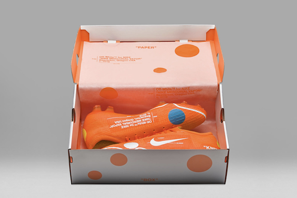 Sur un version de Mercurial Vapor 360 chère à Kylian Mbappé, Virgil Abloh a posé sa touche personnelle. En mélangeant l’esthétique à l’aspect pratique, dans le sens où les efforts de créations sont portés sur les zones les plus sensibles de la chaussure, à tout le moins celles qui comptent le plus, notamment dans l’exercice de frappe de balle. Virgil Abloh y voit un double message : aider le porteur des crampons à identifier les zones de frappe et envoyer un signal puissant à l’opposition adverse.
