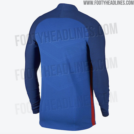 Sur dégradé de bleu, du plus clair sur la poitrine et dans le dos, à du foncé au niveau des épaules et des manches. Manches qui, pour supporter les frimas de la saison hivernale, sont recommandées longues. Ce maillot training 2018 dispose aussi d’un col en zip à ajuster en fonction de l’effort. Une bande rouge épaisse verticale est ajoutée sur les côtés, les imprimés des sponsors du club parisien sont floqués en blanc.