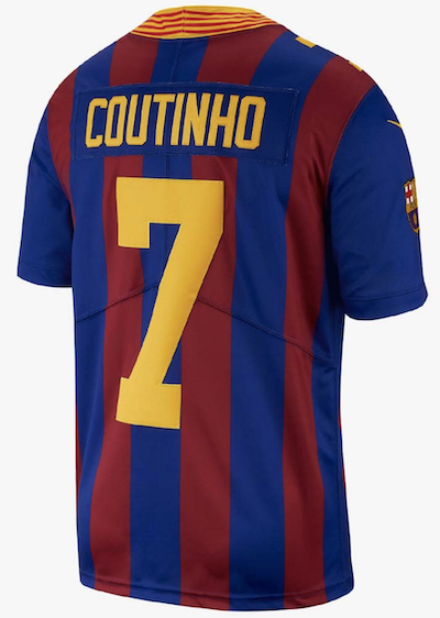 Quelle très bonne initiative que celle prise par Nike avec les clubs premiums que la marque habille. Comme pour Chelsea, Tottenham ou le Barça notamment, la marque de l’Oregon a produit un maillot du PSG en prenant les codes du football tel que le pratiquent nos lointains voisins américains : c’est-à-dire avec les mains. Comme tout est fait à l’envers entre le foot et le soccer, les numéros des joueurs sont visibles en énorme, à l’avant de la tenue.
