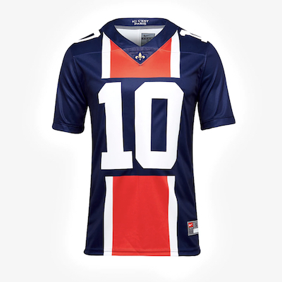 Sinon, les couleurs sont respectées, en bleu marine, rouge et du blanc pour les marqueurs des noms ou des numéros. Avec cette épaisse bande rouge sur l’avant, il rappelle vaguement le maillot porté par les joueurs du Paris Saint-Germain au début des années 80. Quand, à l’époque, la radio RTL était le commanditaire à l’avant. Le col en V est exactement le même que ceux que produit Nike pour les franchises NFL ; ici il présente la fleur de lys iconique, et à l’intérieur du col, la mention, « Ici c’est Paris ».