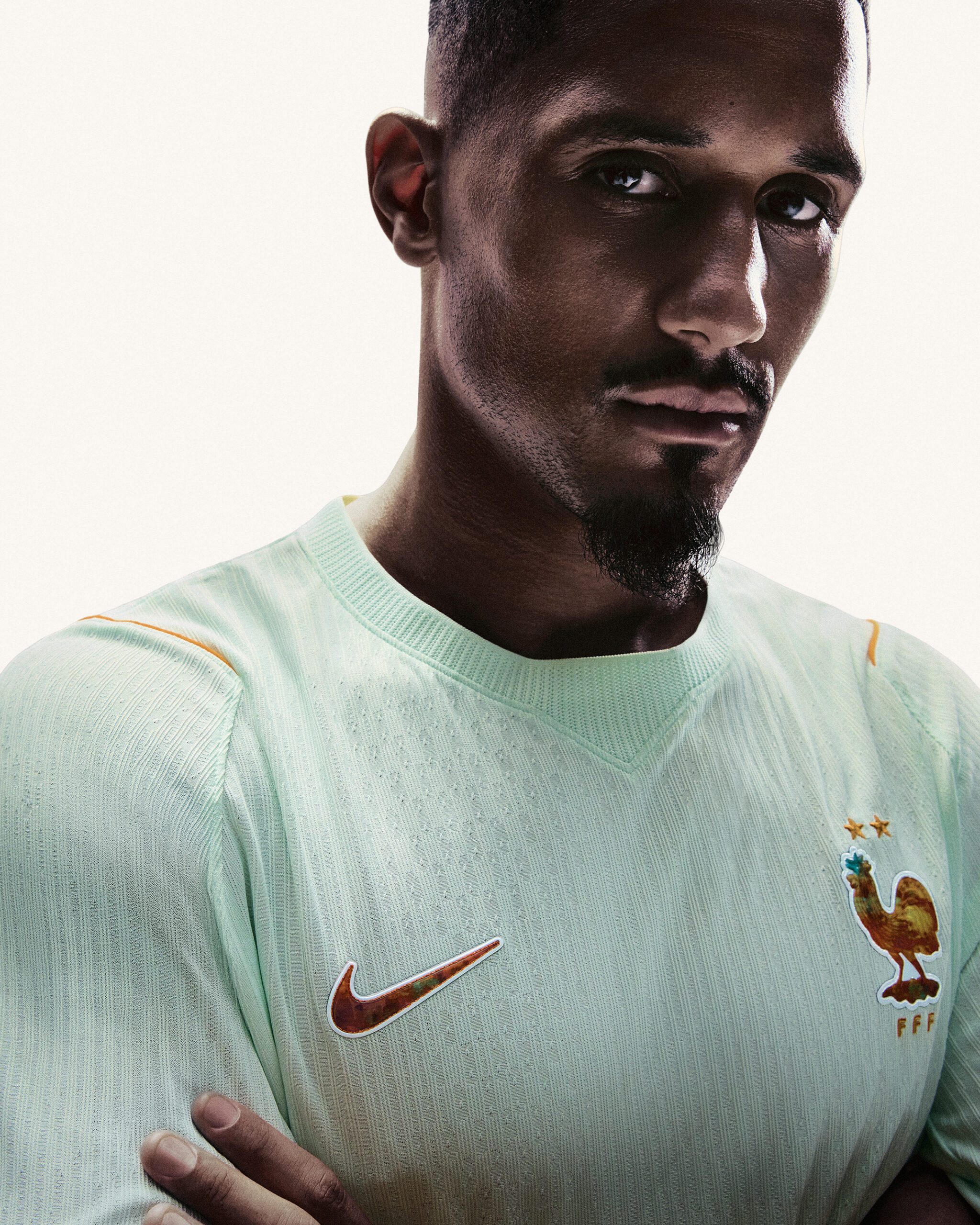 Le maillot extérieur, baptisé « Liberté », s’inspire directement de la patine vert-de-gris du cuivre oxydé de la Statue de la Liberté. Sa teinte principale, dénommée Igloo, contraste avec des accents en cuivre métallisé. Des éléments graphiques intégrés font référence à la statue : sa coiffe, revisitée de façon contemporaine, et une typographie inspirée de sa couronne. Les bordures tricolores des manches, les étiquettes tissées du short et des chaussettes déclinées dans le même vert complètent la silhouette.