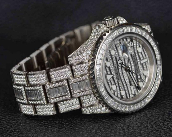 Elle est en or blanc 18 carats, du bracelet au cadran. Avec des diamants qui ondulent pour former l’impression d’une vague. Il s’en compterait 79 sur le boîtier. C’est une Rolex d’un modèle GMT Master II. Elle est étanche jusqu’à 100 mètres, est à remontage automatique avec une réserve de 50 heures.