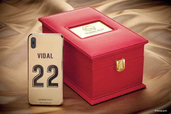 Nouveau pays, nouveau club, nouvelle vie et désormais un nouveau téléphone pour Arturo Vidal. Le milieu de terrain du FC Barcelone a reçu cet appareil de la marque à la pomme, depuis un spécialiste de la customisation, la marque iDesign Gold. C’est l’une de celles que les sportifs du Royaume-Uni plébiscitent, dont les footballeurs parmi lesquels Paul Pogba avec son modèle en noir et or et personnalisé de son logo.