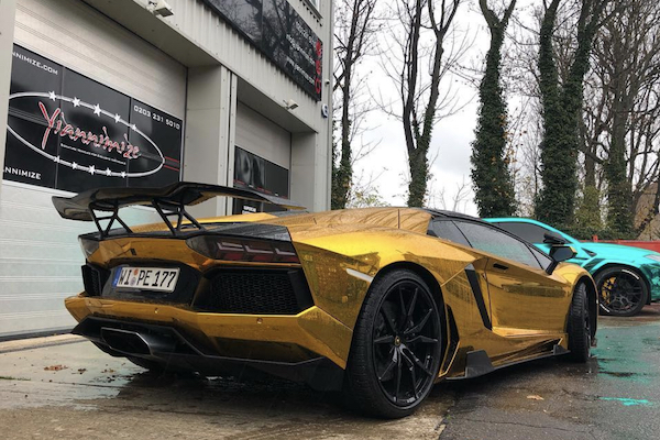 La dernière excentricité de Pierre-Emerick Aubameyang est cette Aventador façon lingot d’or. – Images @yiannimize