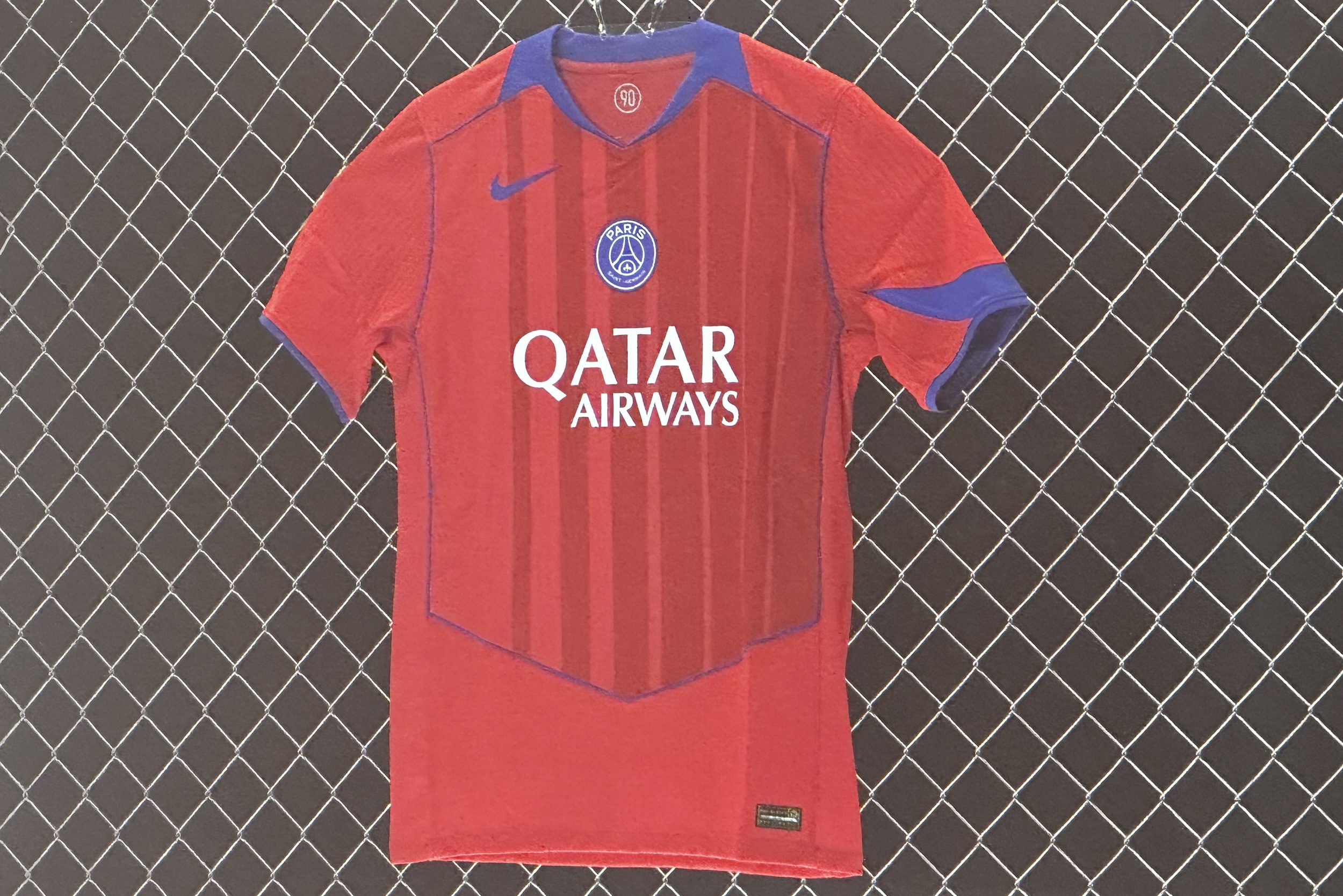 Particularité esthétique, le logo du Paris Saint-Germain est planté au centre et non sur le coeur, comme à l’ordinaire des tuniques du football moderne. La marque 90 est imprimée à l’intérieur du col, le col est bleu comme les bouts de manches. La virgule de l’équipementier Nike l’est également, posée sur la poitrine à gauche.