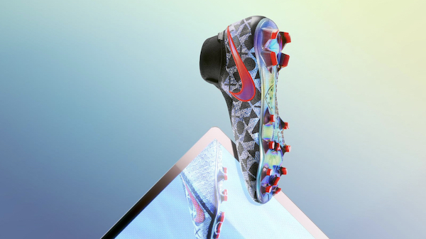 D’un modèle Phantom Vision Elite, l’esthétique est soignée et pensée pour coller à l’univers de EA Sports et de son titre phare, le jeu de foot FIFA 19. Sur la base de crois, de ronds, de triangles ou de carrés sur l’empeigne ; c’est une sorte de rappel des touches de la manette des consoles de la marque Sony, partenaire de l’éditeur canadien. De couleur d’ensemble holographique, surtout sous la semelle, ces chaussures ont le bout des crampons et la Virgule du logo de Nike en rouge.