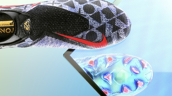 D’un modèle Phantom Vision Elite, l’esthétique est soignée et pensée pour coller à l’univers de EA Sports et de son titre phare, le jeu de foot FIFA 19. Sur la base de crois, de ronds, de triangles ou de carrés sur l’empeigne ; c’est une sorte de rappel des touches de la manette des consoles de la marque Sony, partenaire de l’éditeur canadien. De couleur d’ensemble holographique, surtout sous la semelle, ces chaussures ont le bout des crampons et la Virgule du logo de Nike en rouge.