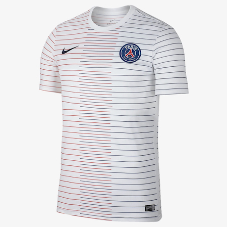 En third, c’est une tenue façon rétro qui se prépare. Tout en blanc, avec une bande bleu et rouge plaquée sur le côté gauche, au niveau du logo du club. Le col façon polo est un retour abandonné depuis quelques années, par la marque à la virgule. Autre sortie déjà actée par l’équipementier US pour le Paris Saint-Germain : les produits de la gamme training. Avec deux maillots, l’un noir et gris foncé plus rouge, très sobre et simple et l’autre blanc, avec de fines lignes rouge ou bleu, en horizontale.
