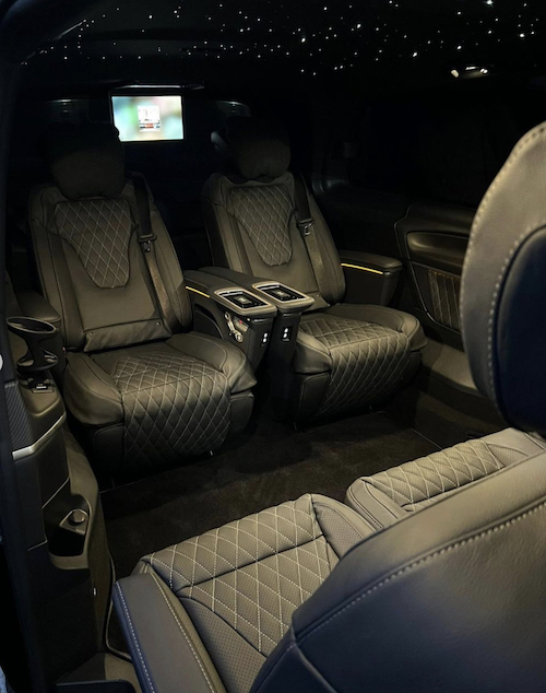 Le van livré est tout noir, à l’intérieur c’est grand luxe (voir images dans le diaporama ci-dessus). Avec un plafonnier truffé de leds, qui donne l’impression d’une nuit étoilée (toit starlight), des selleries en cuir, sur des sièges chauffants. Et sur ce type d’automobile, spécialité de la concession, il y a du wifi à bord, un écran a minima, ou plus selon la demande et pour les gamers, une console de jeu au choix du client. Pour pousser le confort à son maximum, un mini « frigo » pour les boissons est à disposition. Et si Steven Gerrard veut que ses passagers profitent sans le déranger s’il est au volant, il a une séparation de l’avant à l’arrière.