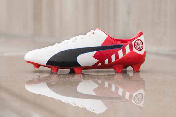 Une paire de Puma evoSPEED rouge et blanche, comme le maillot des Colchoneros