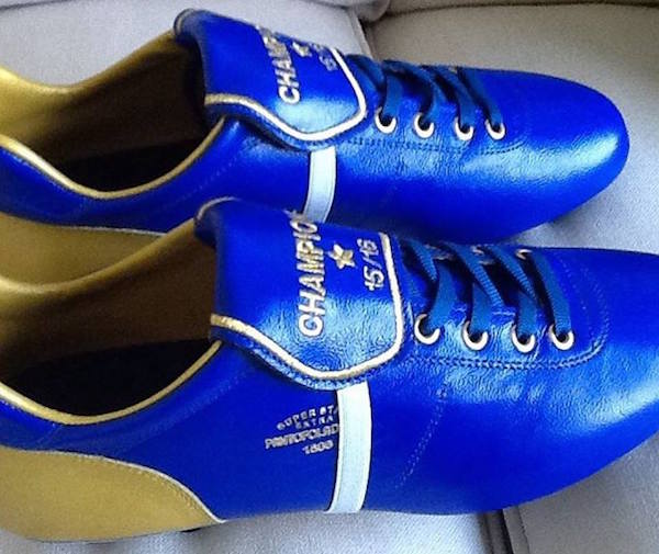 Cette semaine aussi, dans la foulée du titre décroché en Premier League anglaise, Claudio Ranieri a reçu de son sponsor italien, Pantofola d’Oro, cette paire de chaussures uniques, d’or, de blanc et de bleu comme les couleurs de son club. La mention « Champions 15-16 » est floquée en lettre d’or sur le bout de la languette. Sur le talon gauche a été imprimé son prénom Claudio ; sur l’autre son nom Ranieri. Regardez…