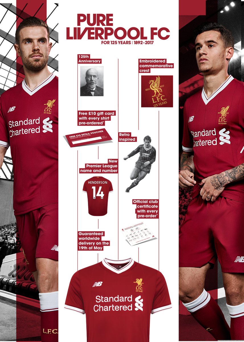 Pour l’exercice 2017-2018, le maillot domicile est un clin d’oeil aux années de gloire des Reds dans les années 70 avec du rouge plus foncé et des fines rayures. Au niveau du design, le col rond a été abandonné pour le col en V blanc. Le bord de manche est également de la même couleur. Les shorts et les chaussettes sont à dominante rouge sur un fond blanc. Cette tunique sera mis en vente sur le site du club à partir du 19 mai prochain et portée par l’équipe le 21 mai lors de la dernière journée de Premier League.