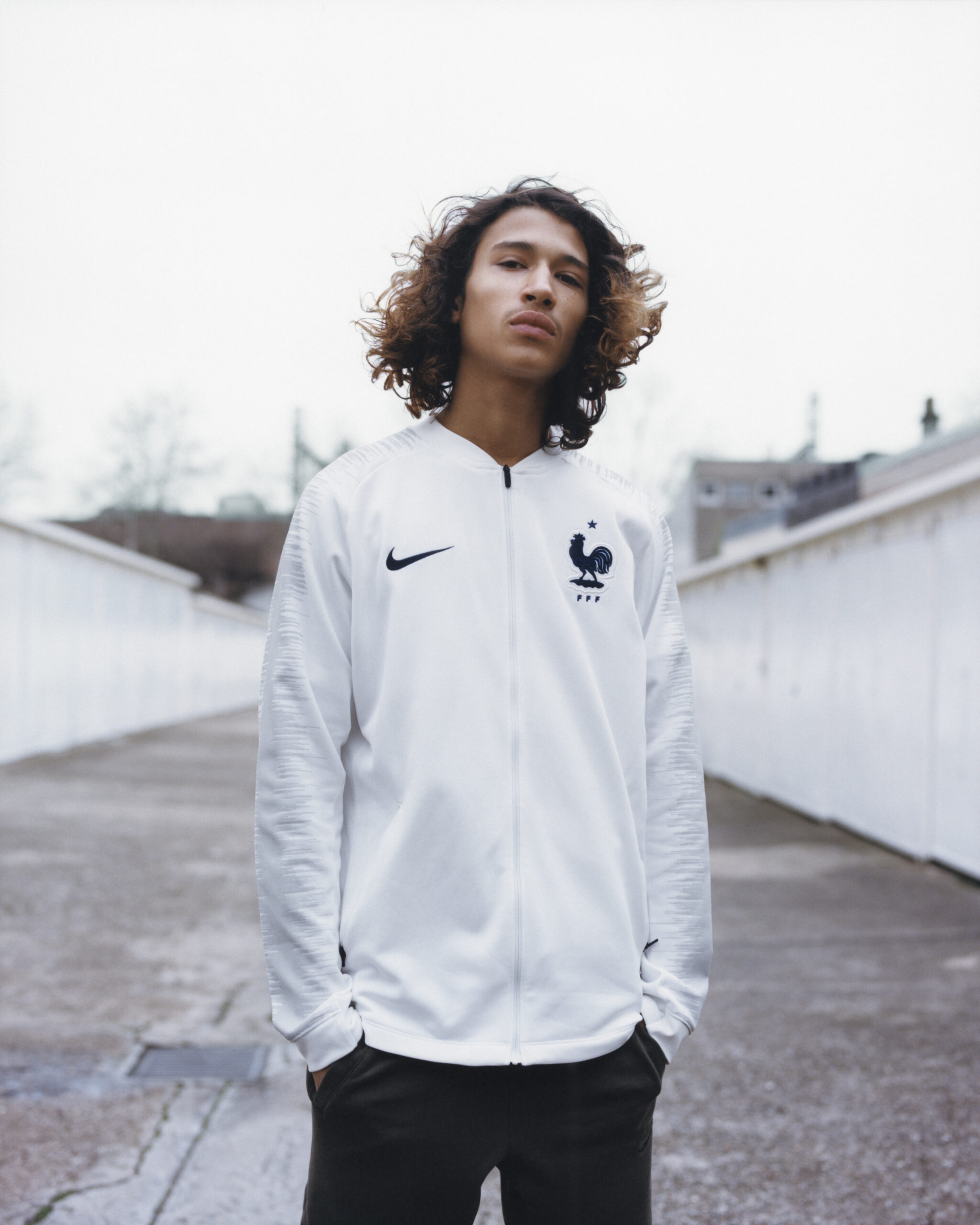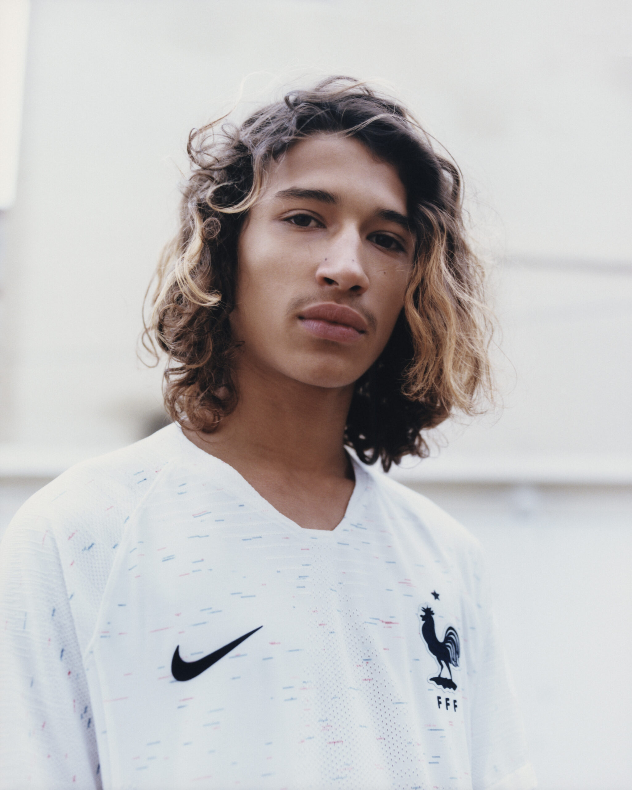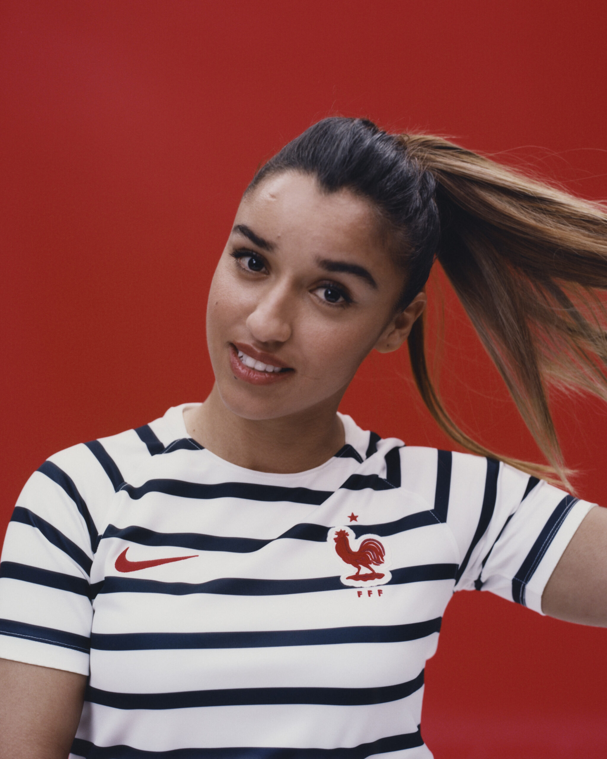 Sakina Karchaoui, défenseur de Montpellier et de l’équipe de France compte elle aussi pour égérie de la marque US. Parce qu’elles n’ont pas de compétition majeure cette année, mais Nike habille aussi les équipes de France féminine. Ici, la joueuse de 22 ans pose avec une marinière, qui servira de tenue d’échauffement des Bleus en Russie.