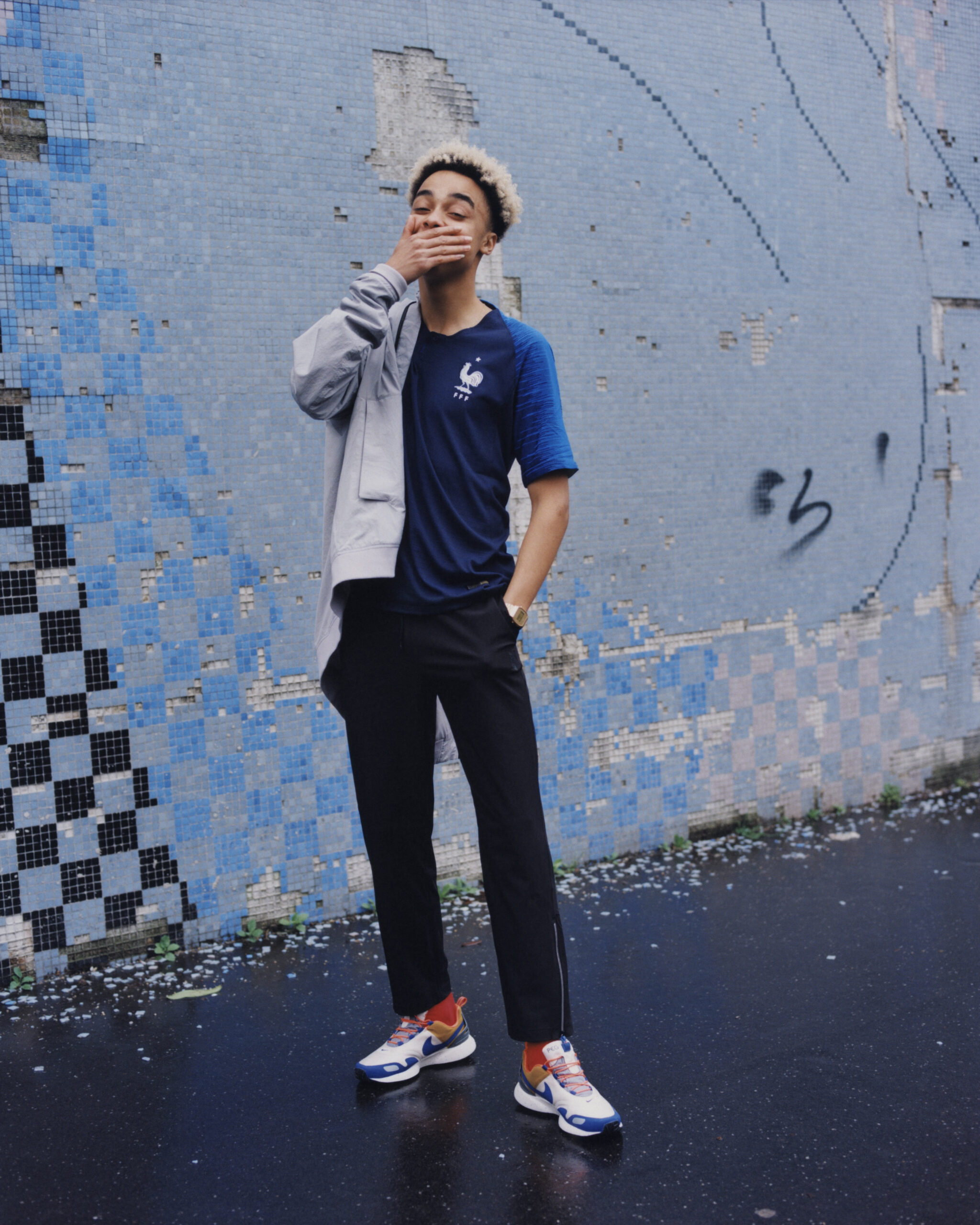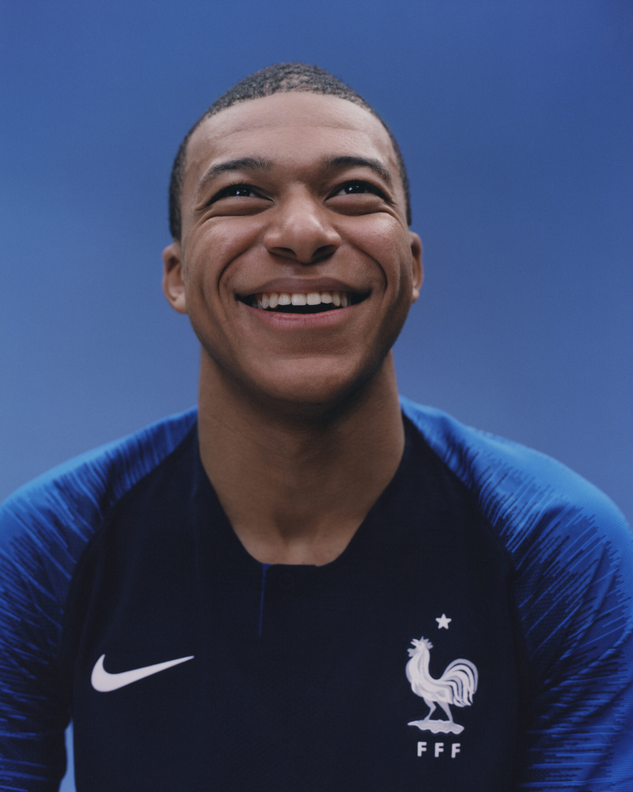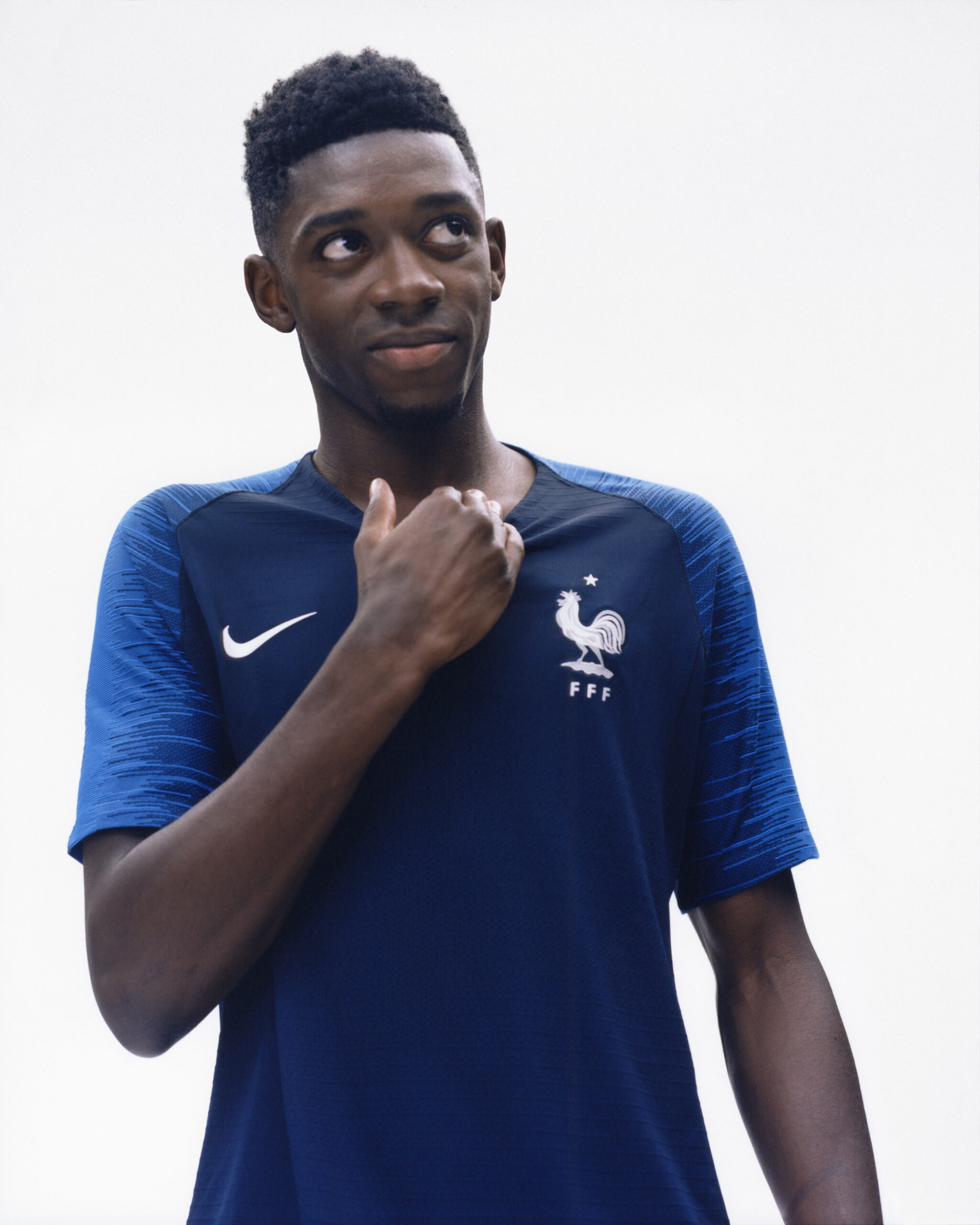 Blanc tacheté de petits traits horizontaux pour la version extérieure ; la principale portée à domicile est bleu foncé uni, avec des épaules et des manches en bleu plus clair et un effet graphique assez typique des maillots Nike du moment. Pour jouer les ambassadeurs, Nike a choisi de plutôt mettre en avant la jeunesse, sinon triomphante à tout le moins montante, plus que des anciens tels que Blaise Matuidi, souvent choisi par le passé. S’y sont collés cette fois, Kylian Mbappé, Ousmane Dembélé, Samuel Umtiti et Raphaël Varane.