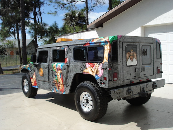 Un Hummer dans l’univers des pin-up et du basket : on ne pouvait pas en attendre moins de l’excentrique Dennis Rodman. L’ex-star des parquets de la NBA était dans son élément au volant de son gros bolide dont raffolent tant les Américains. Mais tout le monde ne peut pas assumer de rouler avec un portrait de lui reluquant la vitre arrière, des femmes dénudées étalées sur la carrosserie et des ballons de basket sur les portières à l’avant.