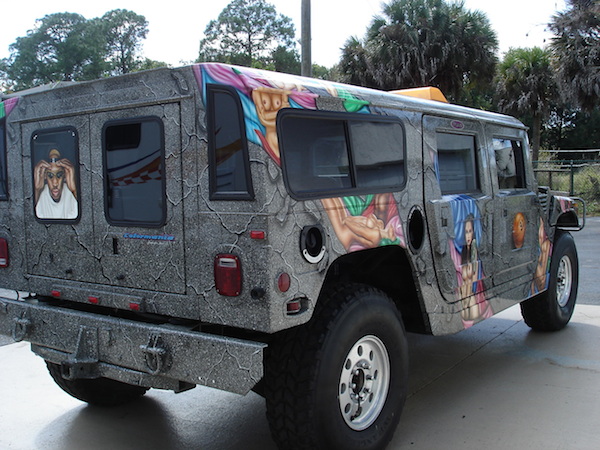 Un Hummer dans l’univers des pin-up et du basket : on ne pouvait pas en attendre moins de l’excentrique Dennis Rodman. L’ex-star des parquets de la NBA était dans son élément au volant de son gros bolide dont raffolent tant les Américains. Mais tout le monde ne peut pas assumer de rouler avec un portrait de lui reluquant la vitre arrière, des femmes dénudées étalées sur la carrosserie et des ballons de basket sur les portières à l’avant.