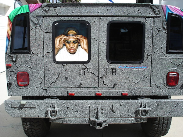 Un Hummer dans l’univers des pin-up et du basket : on ne pouvait pas en attendre moins de l’excentrique Dennis Rodman. L’ex-star des parquets de la NBA était dans son élément au volant de son gros bolide dont raffolent tant les Américains. Mais tout le monde ne peut pas assumer de rouler avec un portrait de lui reluquant la vitre arrière, des femmes dénudées étalées sur la carrosserie et des ballons de basket sur les portières à l’avant.