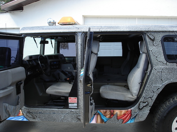 Un Hummer dans l’univers des pin-up et du basket : on ne pouvait pas en attendre moins de l’excentrique Dennis Rodman. L’ex-star des parquets de la NBA était dans son élément au volant de son gros bolide dont raffolent tant les Américains. Mais tout le monde ne peut pas assumer de rouler avec un portrait de lui reluquant la vitre arrière, des femmes dénudées étalées sur la carrosserie et des ballons de basket sur les portières à l’avant.