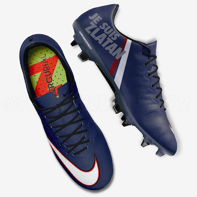 Dommage car il y a de l’idée avec ces pompes de modèle Nike Mercurial Vapor X (celui que porte d’ordinaire l’international suédois) aux couleurs intégrales du Paris Saint-Germain et barrées de la mention « Je suis Zlatan ». Voyez-y une référence à la biographie du joueur, Jag är Zlatan en Suédois, Je suis Zlatan en Français.
