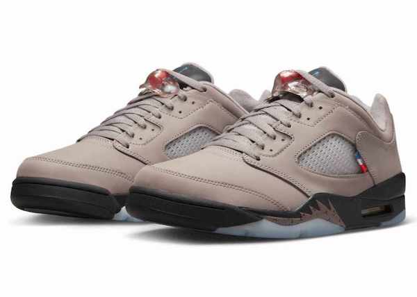 La paire a été révélée aux yeux du monde, lors du Quai 54 en juillet dernier à Paris, par la star américaine de basket Zion Williamson, également ambassadeur de la marque Jordan. À dominante grise, avec des variations noire, brune et taupe, la nouvelle Air Jordan 5 Low s’accorde avec le maillot away dévoilé ce mardi. Cette basket présente de nombreux détails, comme l’ajout d’une étiquette tricolore frappée de l’inscription « PANAME » (surnom de la ville lumière), ainsi que le sceau de la collaboration PSG x Jordan sur le talon ; visuel également présent sur la semelle de la chaussure.
